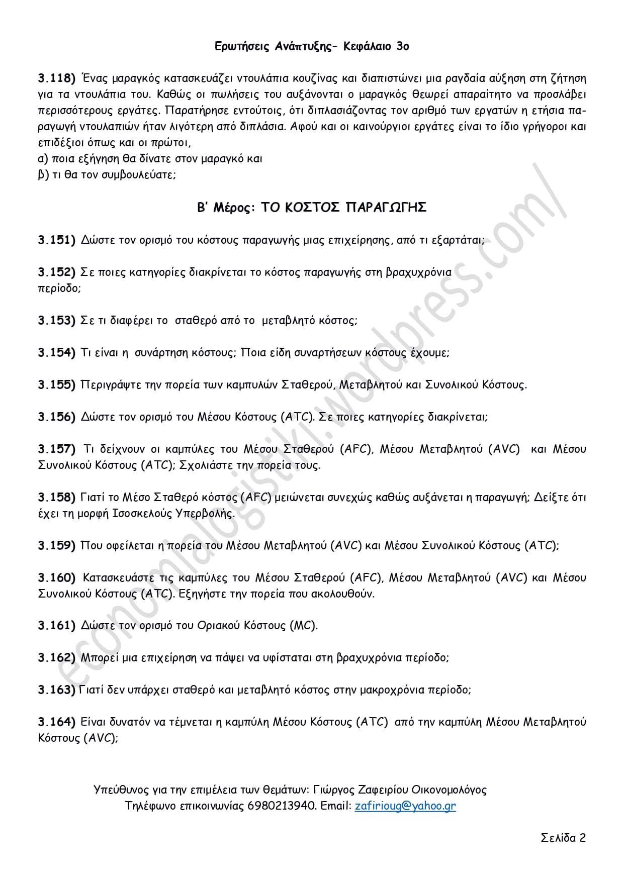 Η αρίθμηση ξεκινά από το νούμερο 101 όπως όλες οι ερωτήσεις ανάπτυξης, ενώ προηγείται ο αριθμός 3 δηλωτικός του κεφαλαίου. Στο συγκεκριμένο κεφάλαιο μόνο, όσες ερωτήσεις αφορούν το Β Μέρος (Κόστος Παραγωγής) ξεκινάνε από τον αριθμό 151. Έτσι η ερώτηση 3.107 είναι ερώτηση ανάπτυξης Νο 7 από το Α’ μέρος Παραγωγή από το κεφάλαιο 3, ενώ η ερώτηση 3.156 είναι ερώτηση ανάπτυξης Νο 6 από το Β’ μέρος Κόστος Παραγωγής από το κεφάλαιο 3
